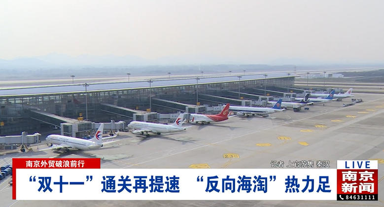 11月11日下午2點多,南京空港跨境電商和國際快件一站式處理中心內一片繁忙景象。叉車來回穿梭,馬不停蹄地運送著跨境電商出口貨物,一批批服裝、箱包等商品整齊排列,正等待通關出口。